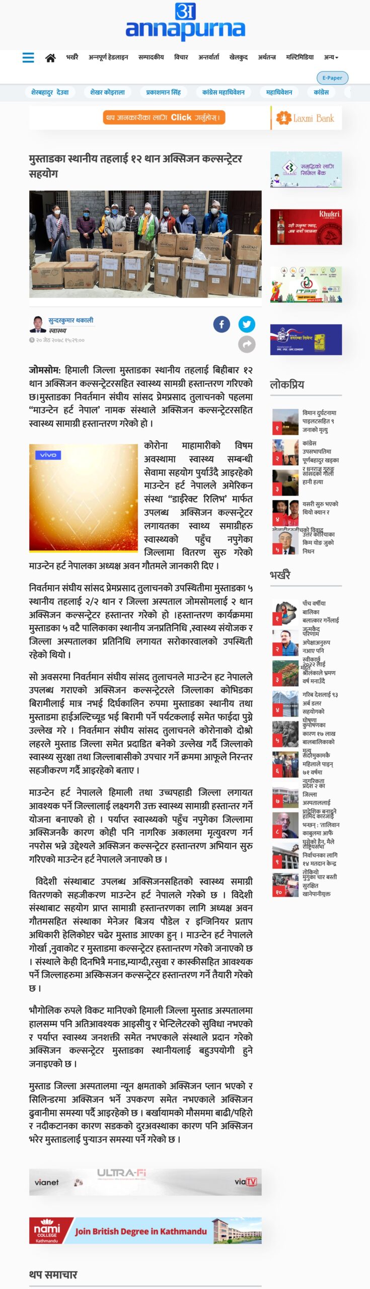 Assistance of 12 Oxygen Concentrators to the local levels of Mustang