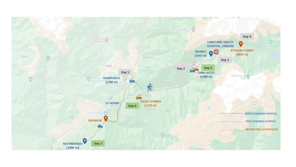 The proposed Langtang Valley Hospital site is located in Sindum within the Gosaikunda Rural Municipality of the Langtang Valley. Access to the hospital site entails a short trek through the Langtang National Park. Daily local buses leave at 6-7 AM from Gongabu Bus Station in Kathmandu, heading towards Dhunche. Alternatively, you can choose to hire a private vehicle to travel to Syaprubesi, where you can rest and prepare for the trek ahead. Your journey towards Sindum includes a another planned overnight stay at Lama Hotel. You will arrive at the designated site for the construction of Langtang Valley Hospital by the Siddhasthali Rural Community Hospital on the third day.